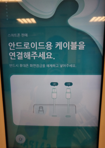 아래 쪽에 문이 열리면 케이블이 3개가 달려 있습니다. 자신의 폰에 맞는 케이블을 연결해 줍니다. 폰이 켜진 상태에서 화면 잠금을 해제하고 넣어줍니다. 저는 폰을 안 켜고 연결했더니 인식을 못해서 다시 처음부터 시작했네요. 케이블을 연결하고 폰을 놓을 위치가 선으로 그려져 있습니다.