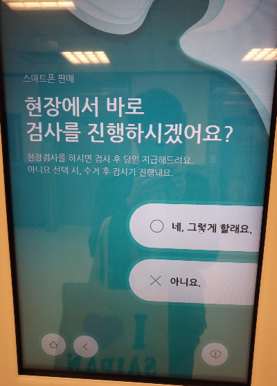 휴대폰 판매로 들어가서 현장 검사로 판매를 선택하였습니다. 전원이 잘 들어오는 안드로이드 또는 iOS의 국산폰이나 아이폰만 가능하다고 멘트가 나오네요. 즉, 샤오미나 화웨이 같은 외산폰은 안 된다는 의미. 순서대로 진행했던 사진 차례대로 붙여 봅니다.