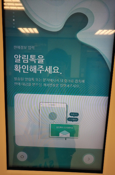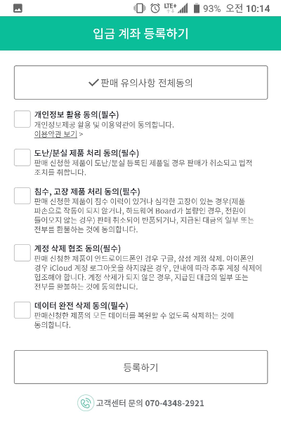이제 카톡 알림으로 들어온 내용을 확인해 봅니다. 알림톡 하단에 계좌번호 입력을 선택하면 계좌번호를 등록하는 화면으로 이동합니다. 하단에 판매 유의사항에 동의하고 등록하기를 누르면 끝입니다.