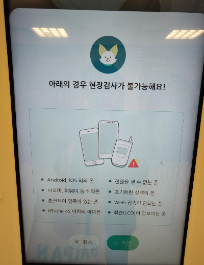 현장 검사가 불가능한 경우는 Android, iOS 이외의 폰, 전원을 켤 수 없는 폰, 샤오미 화웨이 등 해외폰, 초기화한 상태의 폰(저는 초기화해서 가져 갔는데 초기화 후 화면 진입이 가능하게 한 상태여서 현장 검사가 가능했습니다), 충전잭이 옆쪽에 있는 폰, Wi-Fi 접속이 안되는 폰, iPhone 4S 이하의 아이폰, 화면(LCD)이 안 보이는 폰 으로 명시되어 있네요.