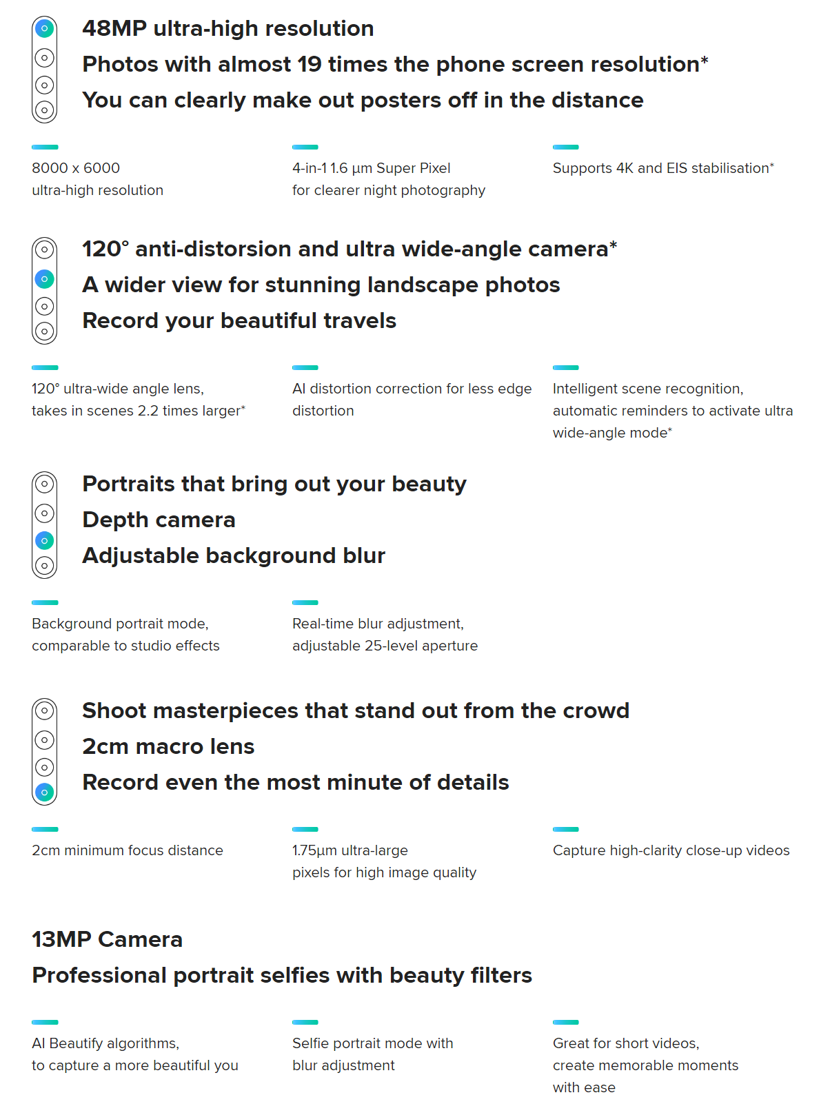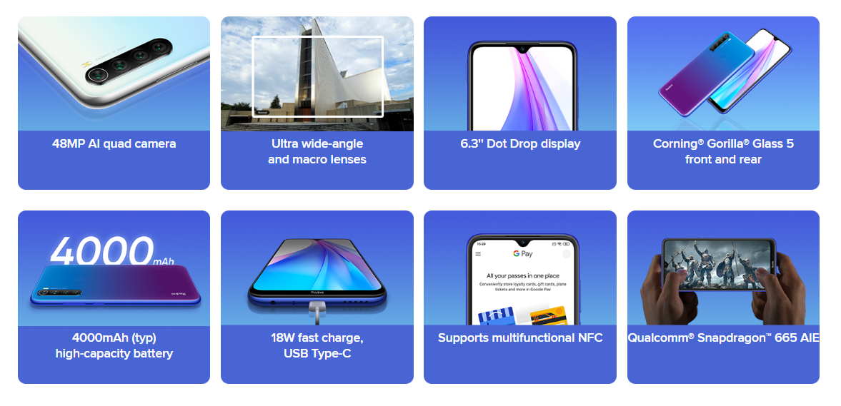 특징을 정리해 보면, 4800만 화소 쿼드 카메라, 초광각 및 접사 렌즈 카메라 탑재, 6.3인치 물방울 노치 디스플레이, 전후면 코닝 고릴라 글라스 5 탑재, 4000mAh 대용량 배터리, USB-C 타입, 18W 고속 충전 지원, 다기능 NFC 지원, 퀄컴 스냅드래곤 665 탑재 등 입니다.