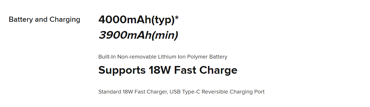 배터리는 4000mAh이고 18W 고속 충전 지원됩니다. 2시간이면 완충 가능하다고 합니다. USB-C 타입 케이블입니다.