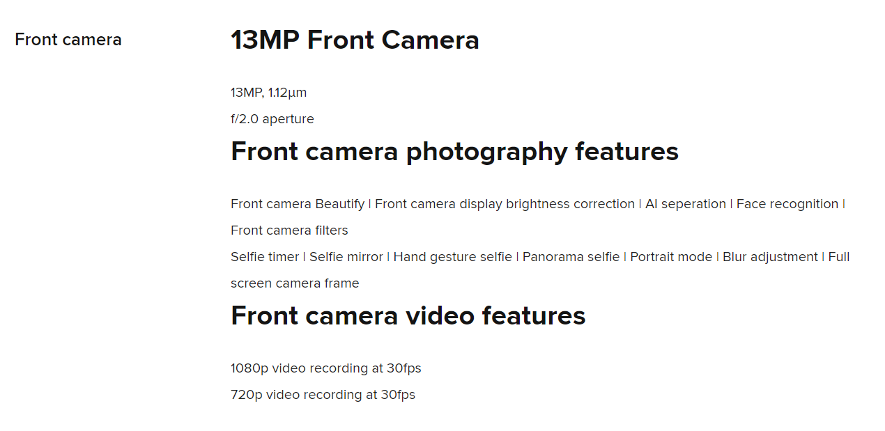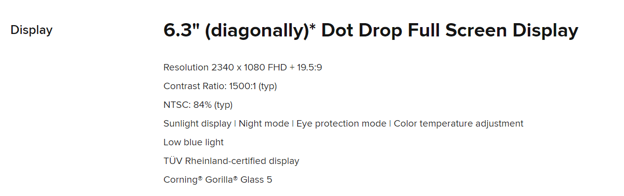 화면은 6.3인치 대화면에 물방울 노치 적용되어 있으며, 전면 디스플레이 비율이 88.3%입니다. 시력보호모드, 색온도 조정, 블루라이트 차단 등의 기능이 소개되어 있습니다. TÜV인증 디스플레이에 코닝 고릴라 글라스 5를 탑재하였습니다. 해상도는 2340 x 1080 Full HD 라고 하네요.