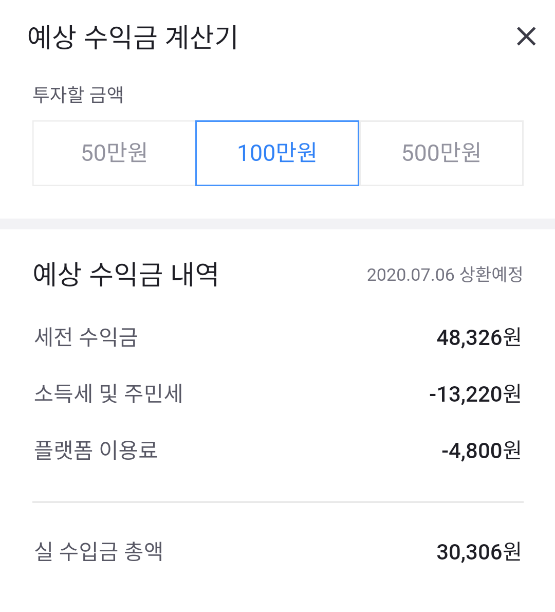 예상 수익금 보기를 누르면 상세 내역이 나오는데 세전 수익금에서 세금과 플랫폼 이용료 라는게 빠지고 실 수익금이 계산됩니다. 플랫폼 이용료가 처음에는 토스에서 빼가는 돈인 줄 알았는데 아마도 제휴사에서 챙겨가는 돈인 것 같습니다. 해당 제휴사 사이트에 들어가도 똑같이 플랫폼 이용료 라는게 있더라구요.