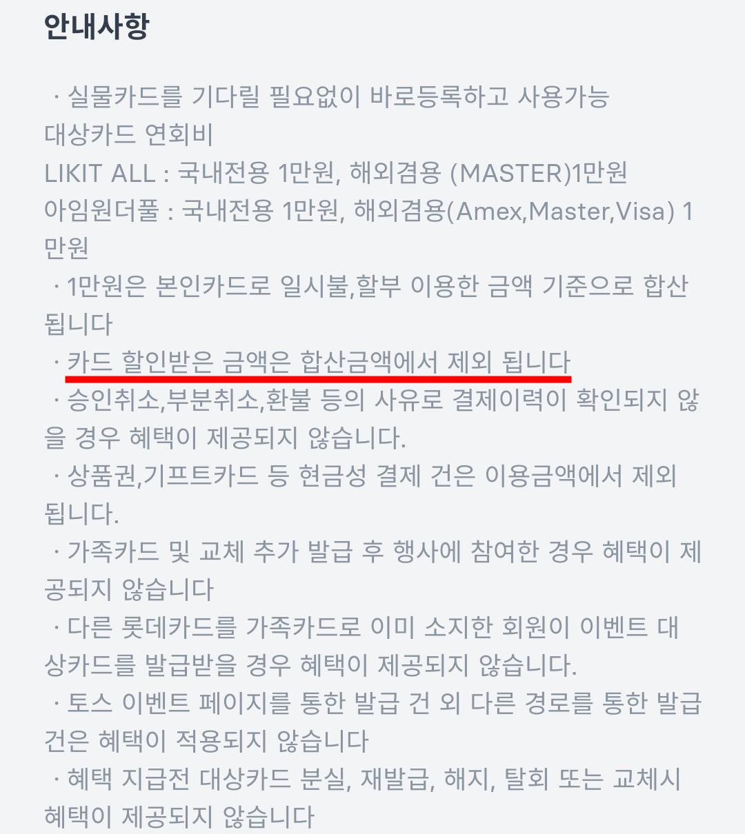 다음으로 중요한게 행사내용입니다. 카드사별로 합산이 아니라 그냥 00만원 이상이라고 적힌 경우도 있던데 합산이 아니라 1건 결제금액이 되어야 하는 건지도 모르겠습니다. 제가 신청한 카드는 거의 전 가맹점이 할인되는 카드인데 할인금액은 합산에서 제외한다는 문구가 있네요. 처음에는 할인결제 건으로 잘못 보고 어디서 써야하나 고민하기도 했네요. ㅎ