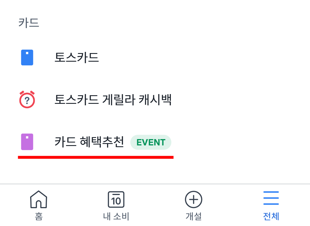 토스앱을 실행하고 전체 메뉴 - 카드 - 카드 혜택 추천을 선택합니다.