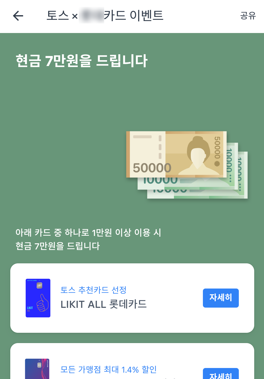 하단의 행사관련 상세 내용을 꼭 읽어봅니다. 토스 앱에서 카드를 신청하고 발급받은 경우에 행사대상이 되고, 최근 1년간 해당 카드사 결제이력이 없는 사람이어야 합니다.