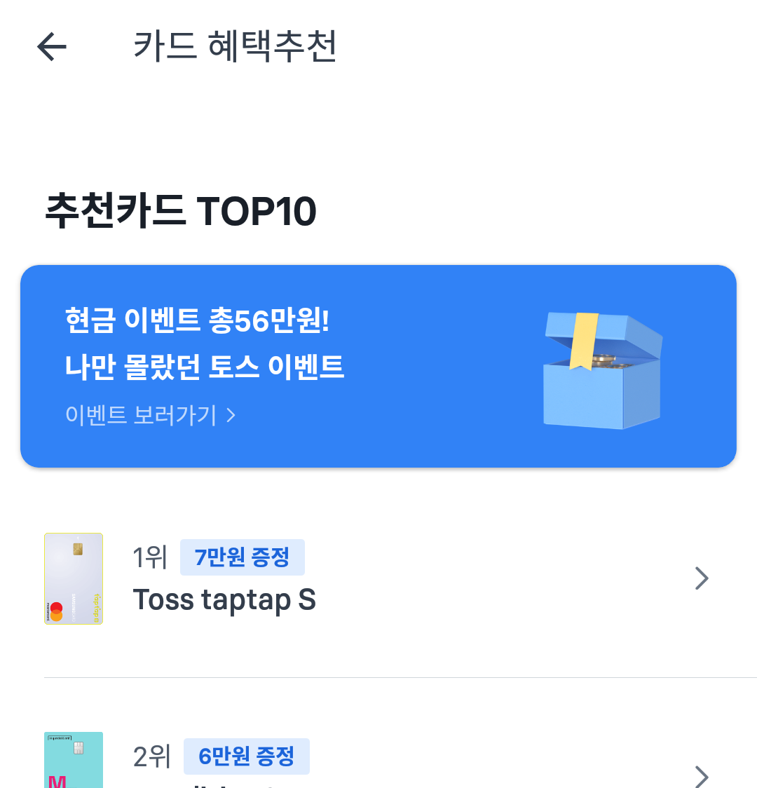 들어가면 추천카드 순위가 나오고 상단에 현금 이벤트라는 배너가 보입니다. 터치해서 들어갑니다.
