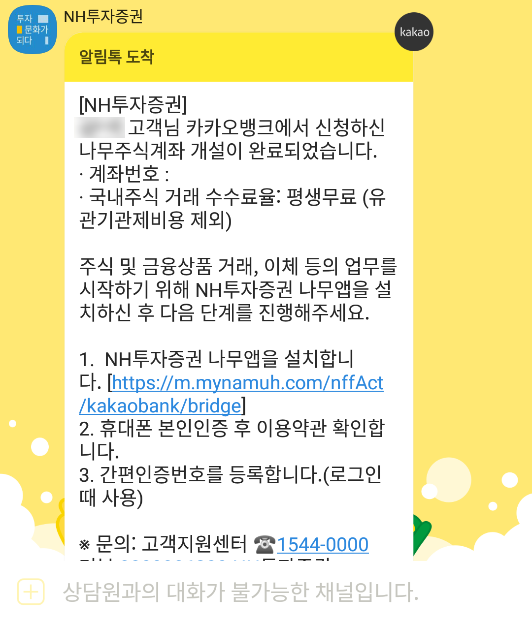 문자로는 계좌 개설 신청 접수라고 뜨면서 순차적으로 진행되어 시간이 소요된다고 적혀 있습니다만, 거의 동시에 들어온 카카오톡 알림에는 계좌개설 완료되었다고 하네요. 링크를 타고 들어가서 앱을 설치합니다.