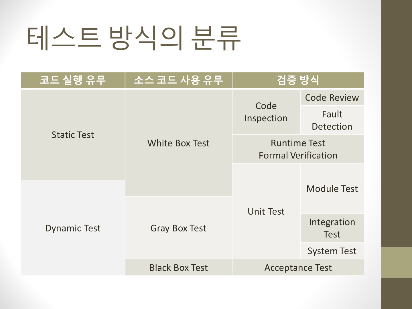 프로그램의 실행 여부에 따라 Static 또는 Dynamic Testing으로 구분합니다.